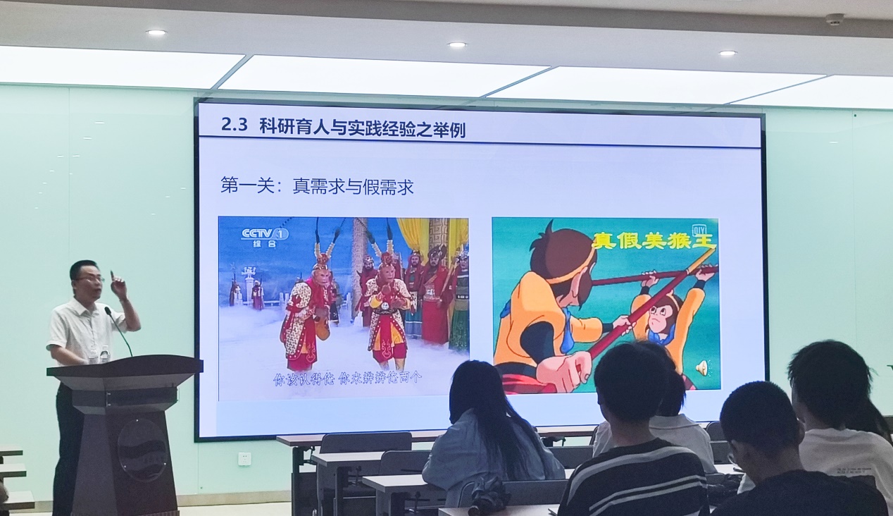 蓝广芊教授深入阐述了科研育人和实践经验的重要性,分别从学生、老师和学校的角度讲述了科研育人的内涵,通过自身案例分析,提出了科研育人新形式、新路径。在讲解中,蓝广芊教授以幽默的语言和形象的真假美猴王类比,向学生们传达了区分真实需求与虚假需求、真正创新与伪创新、真正坚持与虚假坚持的方法。最后,他详细介绍了如何找到科研切入点,帮助同学们学习如何选题以及找到自己的研究方向。