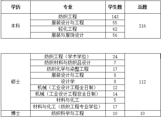 设有4个本科专业:纺织工程、服装设计与工程、轻化工程、服装与服饰设计。