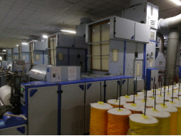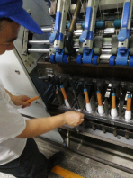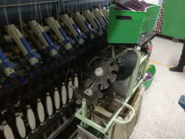 络筒是后纺的主要工序,也是自动化程度最高的一个工序,在车间老师的讲解下,我们认真学习了自动络筒机的结构及工作原理。通过在车头调节各项参数,可以时间不同种类纱线的自动络筒。车间里一共有41台自动络筒机,来自日本村田。一般情况下,络筒时间在2-3小时左右,每筒纱依据种类不同总长度不同,但均在10万米以上。我们还观察到,后纺车间目前所用的机器几乎全部依赖进口,没有看到国产机器是比较遗憾的。